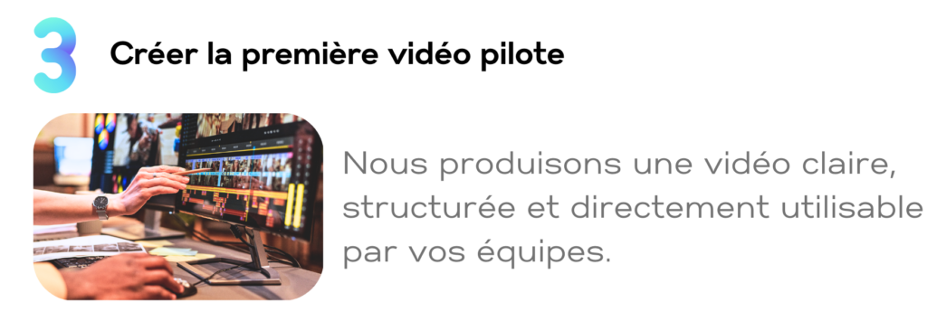 Une première vidéo pilote pour valider l’approche dans votre entreprise. Nous transformons vos gestes métier en vidéos pour former plus vite et stabiliser votre activité.